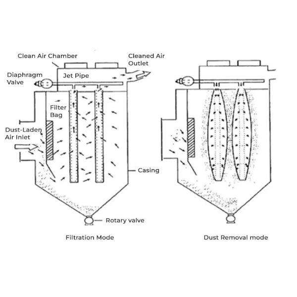 For å sikre at posene ikke blir tilstoppet av støv, brukes en rensemekanisme for å fjerne støvet fra filterposene med jevne mellomrom. Dette gjøres vanligvis ved hjelp av trykkluft, som blåser støvet av filterposene og sender det inn i beholderen for avhending.
