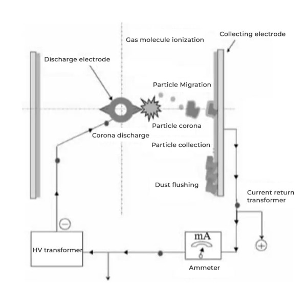 En elektrostatisk precipitator (ESP) er en svært effektiv enhet som brukes til å fjerne suspendert partikkelmateriale fra industrielle avgasser. ESP fungerer etter prinsippet om elektrostatisk tiltrekning, der luftbårne partikler lades og deretter samles på en jordet overflate, og fjerner dem fra luften. Enheten består vanligvis av to nøkkelkomponenter: en utladningselektrode og en kollektorelektrode. Når høyspent likestrøm (DC) påføres utladningselektroden, genereres et sterkt elektrisk felt. Dette feltet ioniserer partiklene i luften, noe som får dem til å få en negativ ladning. De negativt ladede partiklene trekkes deretter til den positivt jordede oppsamleren, hvor de samles og til slutt fjernes gjennom en kombinasjon av vibrasjon og mekaniske metoder.